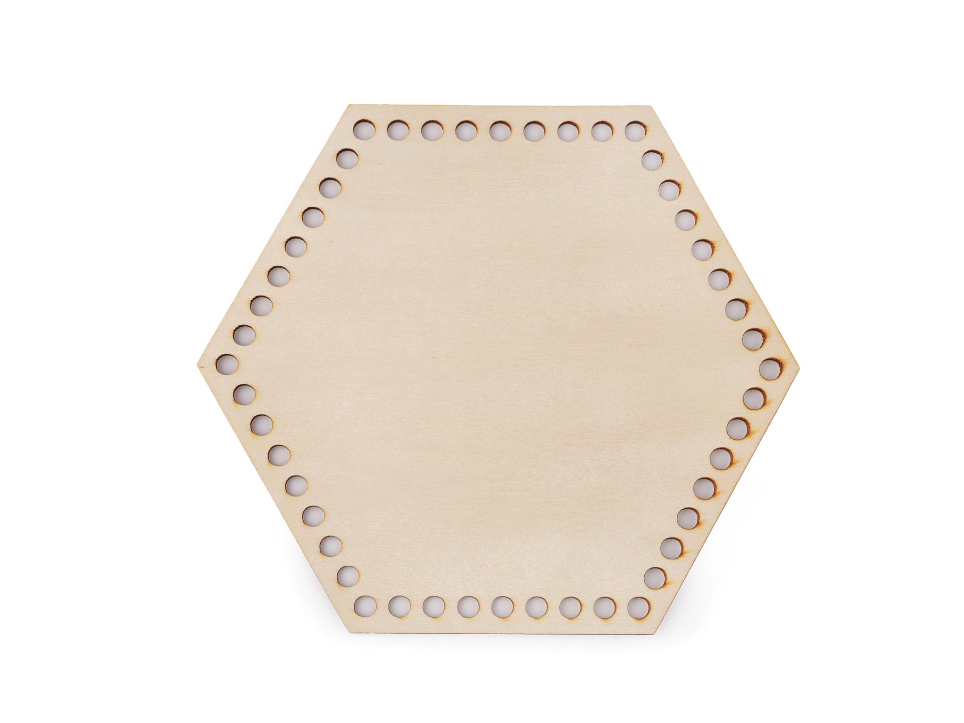 Drevený šesťhran s vyvŕtanými otvormi ideálne na háčkovanie a výrobu košíkov.