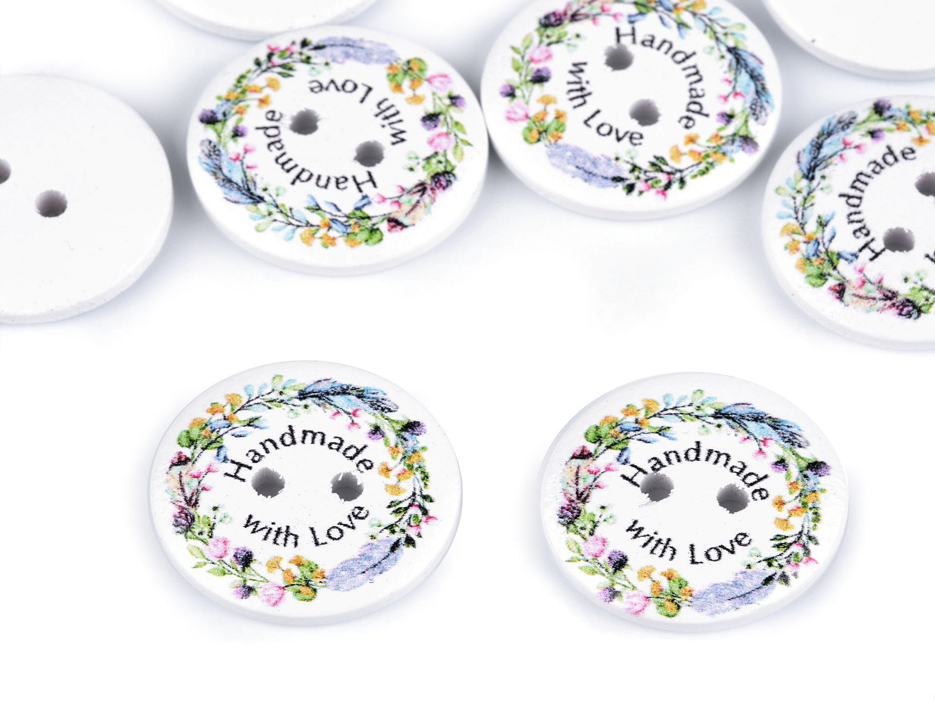 - Drevený gombík s jednostranným nápisom "Handmade with love",